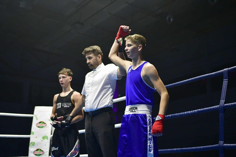 A fővárosi Madárfészek Akadémián rendezett magyar–angol meghívásos csapatversenyen Burai Adrián Dominik, a KESI ökölvívója, a 48 kilogrammos U17-es korosztályban mérkőzött meg Alfie Curtis ellen.