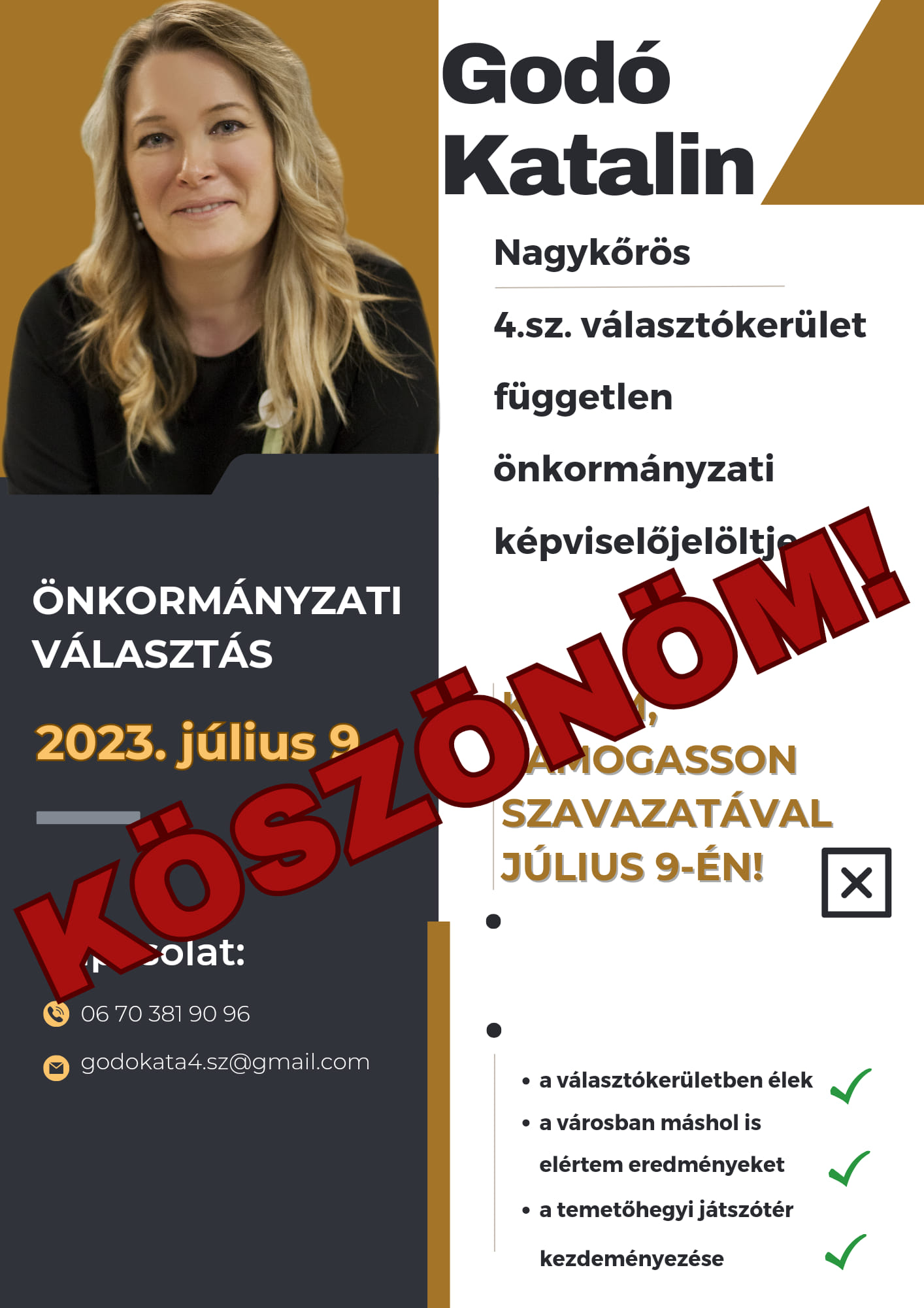 Viszont ez a beszélgetés elgondolkodtatott: miért ne próbáljam meg? Ahogy érlelődött bennem a gondolat, sorban érkeztek a megkeresések ellenzéki pártok és szervezetek részéről, akik azt mondták, hogy a személyemben bíznak, tehát ha indulok függetlenként, akkor a párt, szervezet nem állít velem szemben jelöltet. Nagyon megtisztelő volt ez a bizalom számomra. És nagyon örültem az összefogásnak! Végül is a szórólapozásban, mozgósításban, a bizottsági munkában mellettem voltak a Jobb Nagykőrösért, MSZP, Nép Pártján, DK képviselői, szimpatizánsai, és sok civil is. Nagyon köszönöm a munkájukat! És természetesen hálás köszönettel tartozom a szavazóknak, ahogyan a családomnak is, hiszen az ő életükben is nehéz időszak volt a kampány, és még mozgalmasabb lesz a következő időszak.