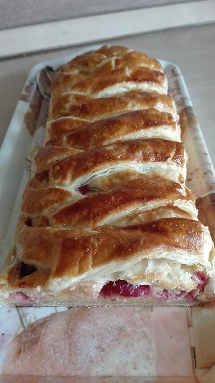 A tésztát kiterítjük és mindkét oldalon srégen bedaraboljuk. A túrót cukorral, sóval, tojással és a búzadarával összekeverjük és a tészta közepére elosztjuk, majd meggyel megszórjuk. A széleit visszahajtjuk, tojással megkenjük és előmelegített sütőben aranybarnára sütjük. A töltelék ízlés szerint variálható, lehet diós, mákos, meggyes-mákos, almás stb.