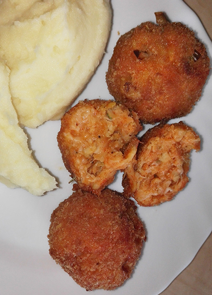 A csirkemellet megsütöm és „szálakra” tépkedem, majd az összes hozzávalóval alaposan összekeverem. Zsemlemorzsába forgatom és forró olajban kisütöm.