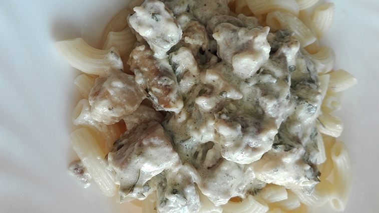 A húst felkockázzuk és átkenjük sóval, borssal, majd kevés olajban 4-5 percen át pirítjuk. Ezt követően felöntjük egy kevés vízzel és hagyjuk főni 15-20 percet. Majd átrakjuk egy hőálló edénybe. A tejfölt, a mustárt, a tejszínt, a zúzott fokhagymát és az apróra vágott petrezselymet összekeverjük, leöntjük vele. 180 fokon sütjük 20 percig, de néha megforgatjuk, majd kínálhatjuk tésztával, rizzsel.