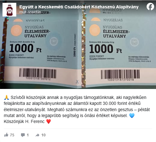 Az Együtt a Kecskeméti Családokért Közhasznú Alapítvány is posztolt a minap egy nyugdíjas támogatójuk nagylelkű felajánlásáról.