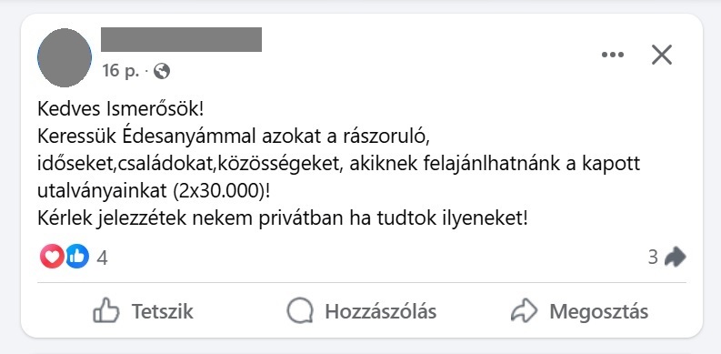 Más a Facebook-on tájékoztatta ismerőseit, hogy szívesen odaadná rászorulóknak az utalványait.